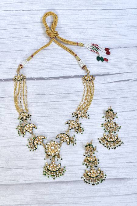 Buy_Saga Jewels_Silver Plated Stones, Beads Moon Shaped Embellished Pendant Necklace Set_at_Aza_Fashions