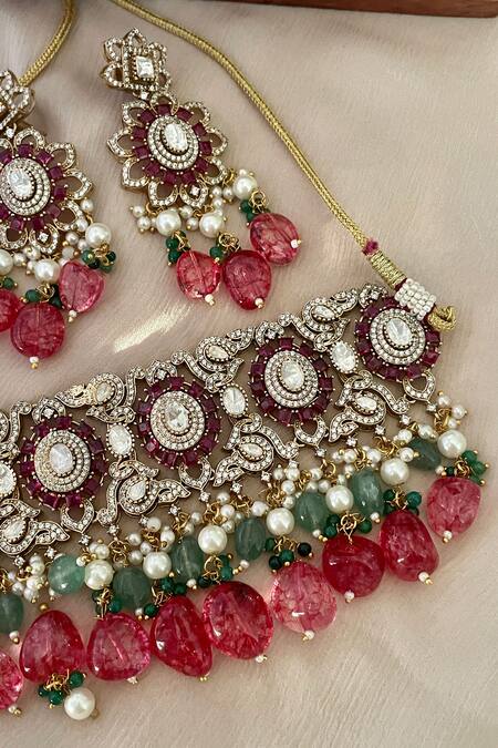 Buy_Saga Jewels_Multi Color Gemstones, Pearls Multi-color Designer Necklace And Earrings Set _at_Aza_Fashions