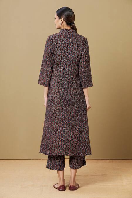 Maroon Ajrakh Embroidery Shirt Collar Kurta And Pant Set