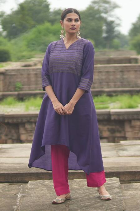 Buy_Sagaa By Vanita_Purple Silk V Neck Color Blocked Kurta Set _Online_at_Aza_Fashions