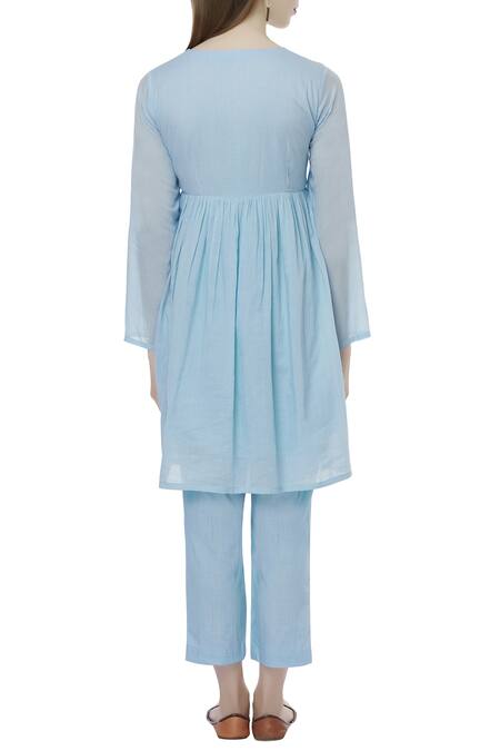 Blue Muslin V Neck Embroidered Kurta And Pant Set
