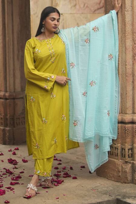Green silk kurta with floral print. Comes with pant and an organza dupatta.