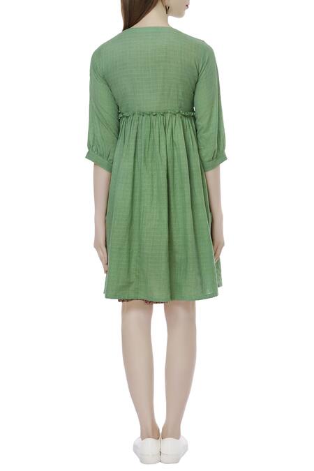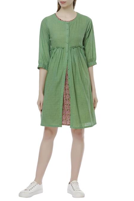 Green Cotton Muslin Round Neck Shirt Dress With Inner