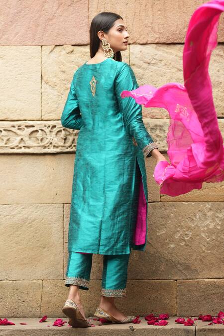 Green silk kurta with an embroidered neckline. Comes with pant and a pink organza dupatta.
