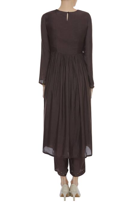 Let your creative style do all the talking in this brunette brown hued cotton silk kurta with pants and dupatta. Beautified with zari and dabka embroidery, this summer-ready outfit deserves a stylish spin out in town.