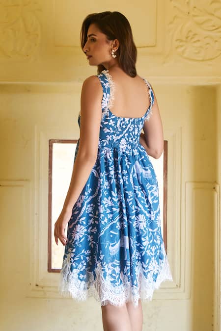 Blue dress featuring floral and elephant prints with chantilly lace embellished scallop border