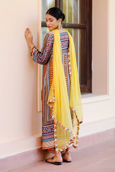 Multicolored kurta with abstract print, Swarovski hand embroidery & round neck. Paired with abstract print tulip pant & printed border dupatta.