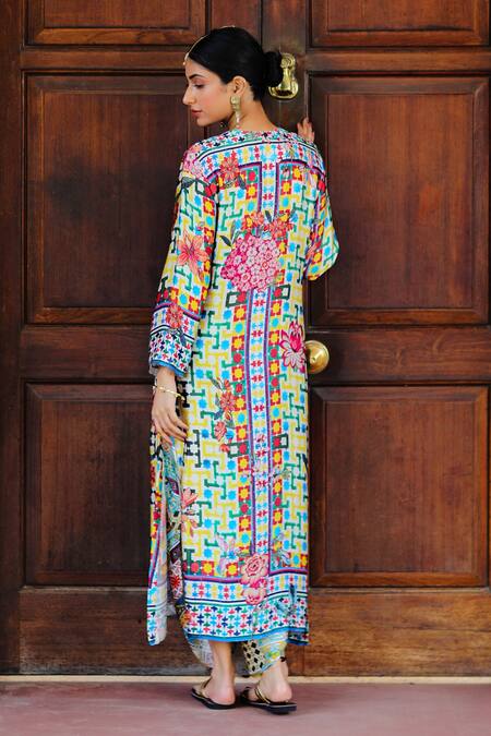 Multicolored kurta with geometric print, Swarovski hand embroidery & round neck. Paired with geometric print tulip pant & printed stripe dupatta.
