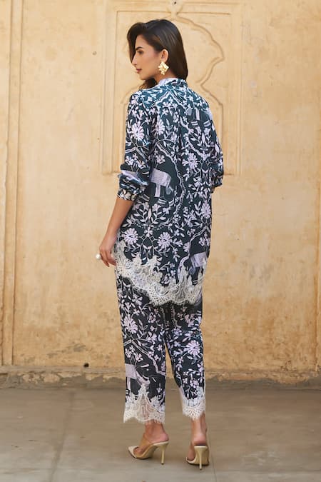 Green tunic style shirt featuring floral, elephant print & chantilly lace embellished scallop border. Paired with matching trousers embellished on the hem.