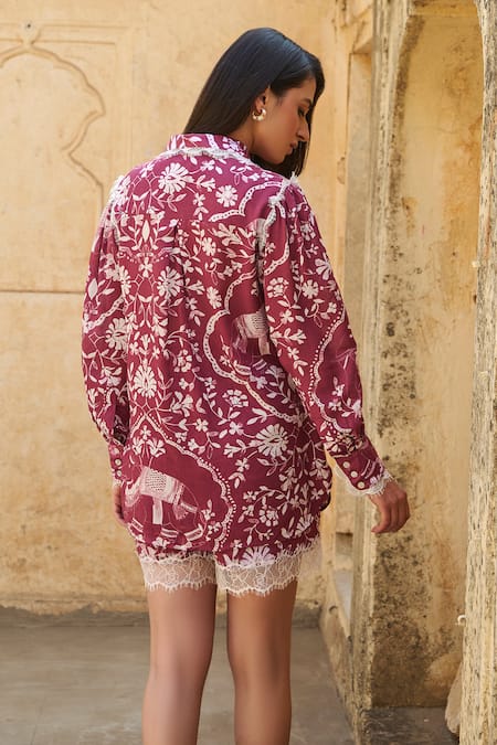 Maroon shirt featuring a collar, full sleeves, floral and elephant prints with chantilly lace embellished scallop border. Paired with matching shorts that have a lace hem detail.