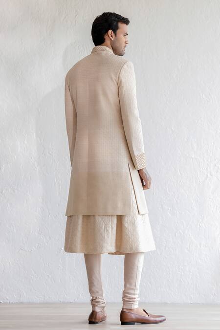 Beige Silk, Chanderi, Cotton Satin, Saheb Kiran Dori Embroidered Sherwani Set