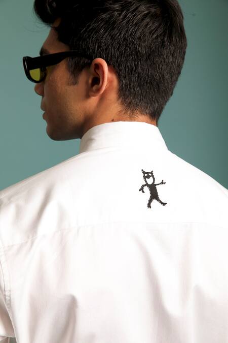 White cotton shirt with black devil screen printed in front and a laser cut devil detail at the back.