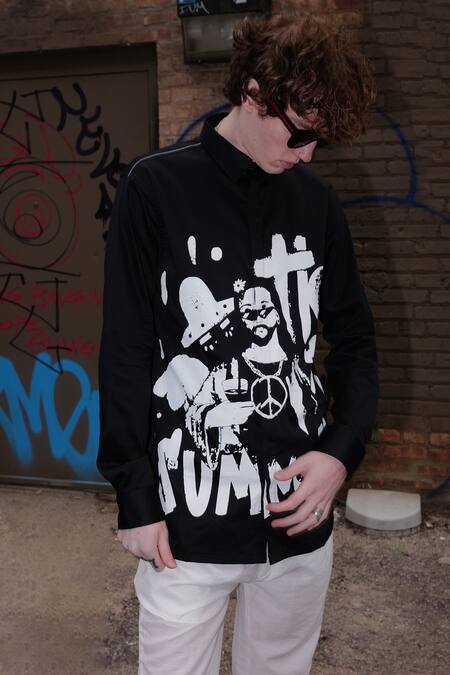 Black cotton shirt with placement screen printed art work, classic collar & cuff sleeves