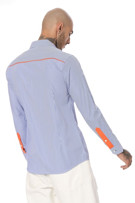 Blue shirt featuring full sleeves, collar neckline, and an all-over striped pattern
