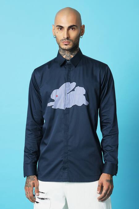 Navy blue shirt featuring full sleeves and a collar with a striped bunny patch work detail