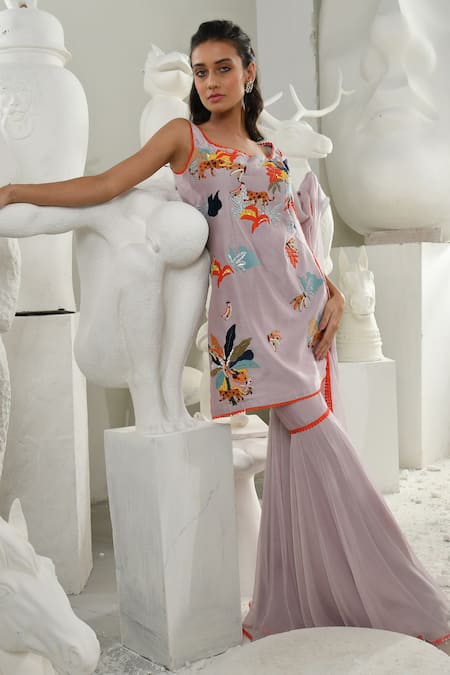 Lilac kurta featuring square neckline and sleeveless design with cutdana, sequin, and thread embroidery in a botanical pattern. Paired with a tiered sharara and a matching dupatta.