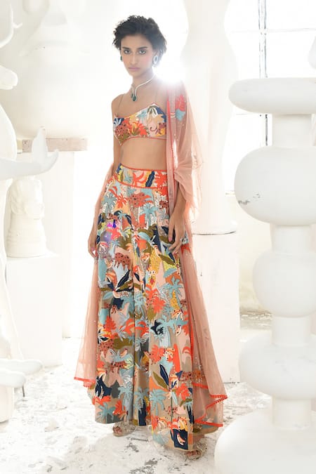 Multicolor blouse featuring thread, sequin, and cutdana embroidery in a floral pattern. Paired with a matching sharara for a cohesive look.