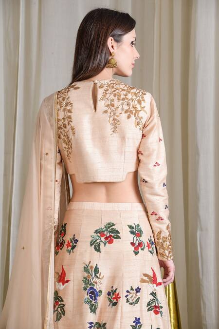 A beige lehenga set based in raw silk featuring a full-sleeved embroidered blouse in gold and silver threadwork. The lehenga is accentuated with multi-colored floral hand embroidery. It comes with a dupatta and fits true to its style.