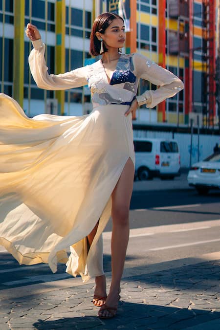 Beige gown featuring abstract pattern applique embroidery on the bodice with a high slit. Comes with a can-can for added volume.