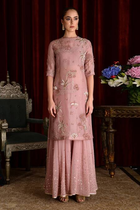 Pink kurta featuring round neckline and three quarter sleeves, highlighted with 3D jungle safari embroidery. Paired with a sequin embroidered sharara and dupatta.