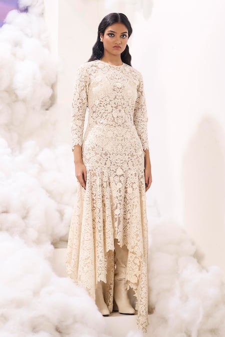 Ivory Soft Net Embroidered 3d Applique Lilian Asymmetric Dress