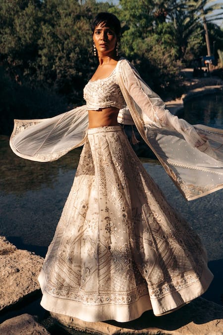 Ivory Organza, Net Embroidery, Beads Scoop Neck Naaz Lehenga And Blouse Set