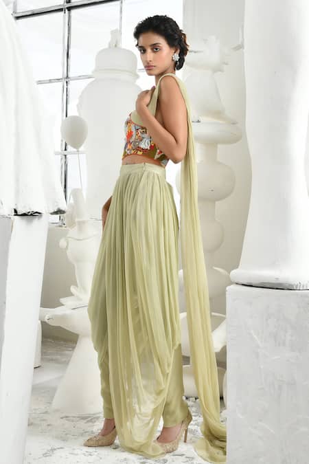 Green Ramie, Silk, Chiffon Sequins, Cut Work, Prisha Corset And Draped Pant Set