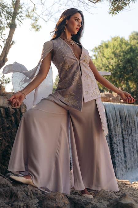 Purple Raw Silk And Crepe Embroidered Floral Patterns Ria Jacket