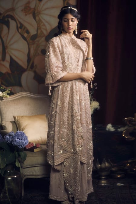 Champagne rose jacket featuring asymmetric panels and embroidered with 3D multi-layered appliques highlighted with zardozi embroidery. Paired with an embroidered palazzo in silk organza and silk crepe.