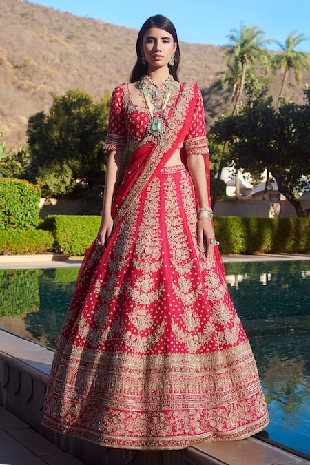 Pink Raw Silk, Net Leaf Neck Zara Bridal Lehenga Set