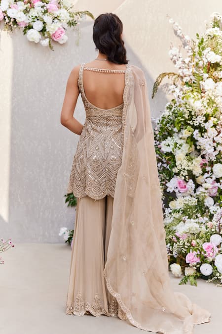Gold peplum kurta featuring antique toned dabka and cutdana embroidered floral motifs. Paired with a scalloped hem sharara and embroidered dupatta.
