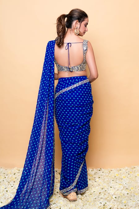 Blue pre-draped saree crafted from georgette featuring hand embroidery and digital print. Paired with a matching embellished blouse in shantoon lining.