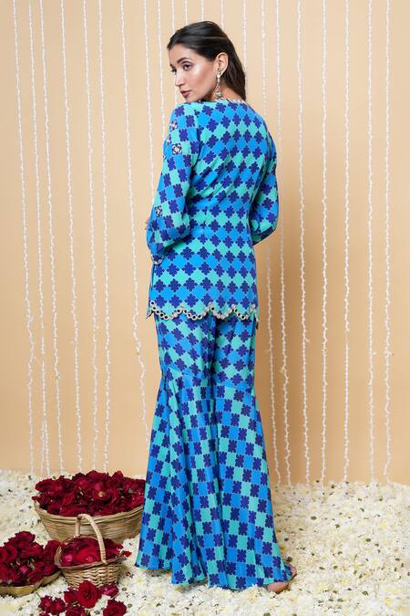 Mehek blue sharara set featuring a short kurta with hand embroidery. The ensemble includes a sharara made from silk crepe and georgette with a shantoon lining.
