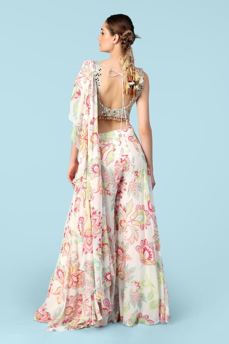 Ivory Georgette Crystals, Beads, Megan Printed Palazzo Saree And Blouse Set