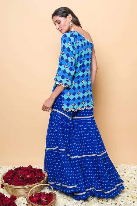 Blue one shoulder kurta featuring hand embroidery and digital print. Paired with a matching sharara made from silk crepe and georgette with shantoon lining.