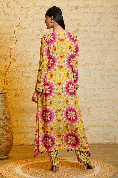 Yellow kurta featuring geometric print, mirror embroidery, and tassel details. Paired with matching printed pants for a coordinated look.