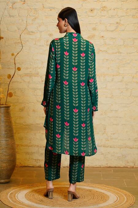 Green silk crepe tunic featuring a collared neckline, long sleeves, and a high-low hem with floral leaf print. Paired with matching printed pants.