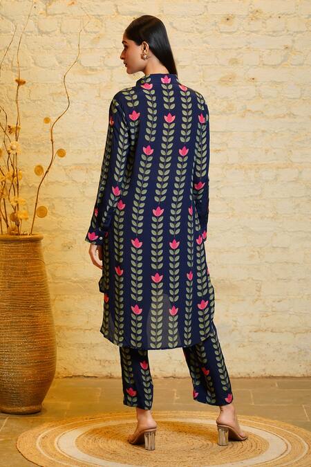 Blue Silk, Crepe Embroidery Collared Sania Printed Kurta And Pant Set