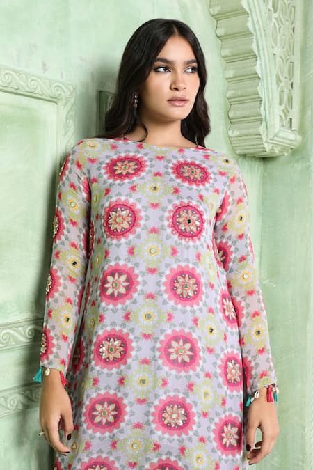 Purple kurta featuring floral mandala print with sequin, bead & cut dana hand work. Paired with a cowl draped dhoti pant that has scalloped lace work.