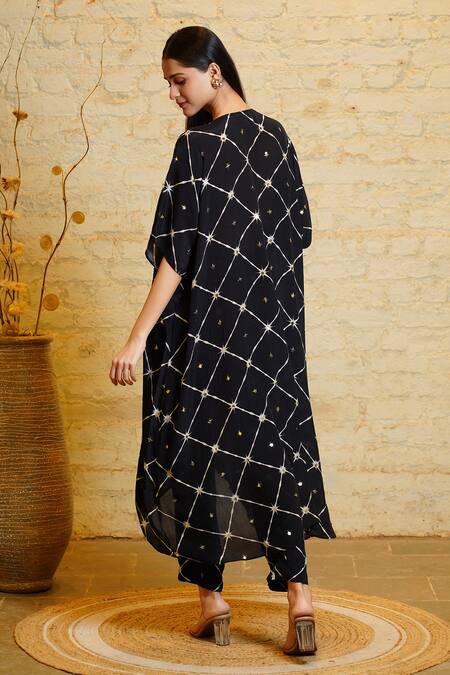Black kaftan featuring placement hand embroidered sequin and mirrorwork, geometric print, and asymmetric hem. Paired with printed straight pant.