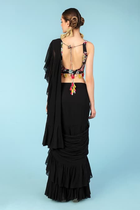Black pre-draped saree featuring multi-layered tiered borders and pleated draped details. Paired with a sleeveless blouse showcasing a multi-color floral print with contrast sequin, bead, and cut dana hand work.