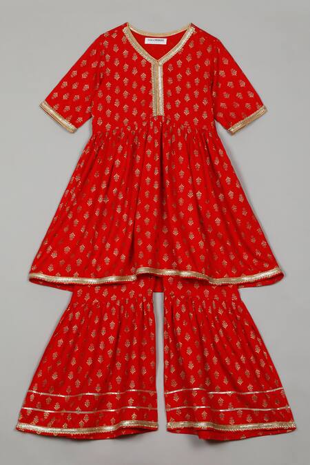 Red peplum kurta featuring floral butti print and scallop lace detailing. Paired with elasticated waist sharara with similar floral print.
