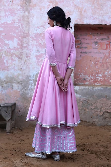 Pink Chanderi Round Embroidered Anarkali And Skirt Set