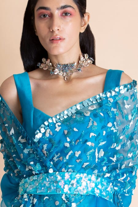 Blue hand embroidered waistbelt featuring all-over 3D floral motif sequin work
