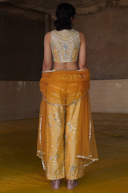 Ochre crop top with patchwork embroidered motifs. Paired with sequin embroidered flared pant & net dupatta.