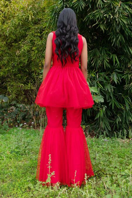Red Chanderi And Net Sequin & Beads, Thread Round Kurta Sharara Set