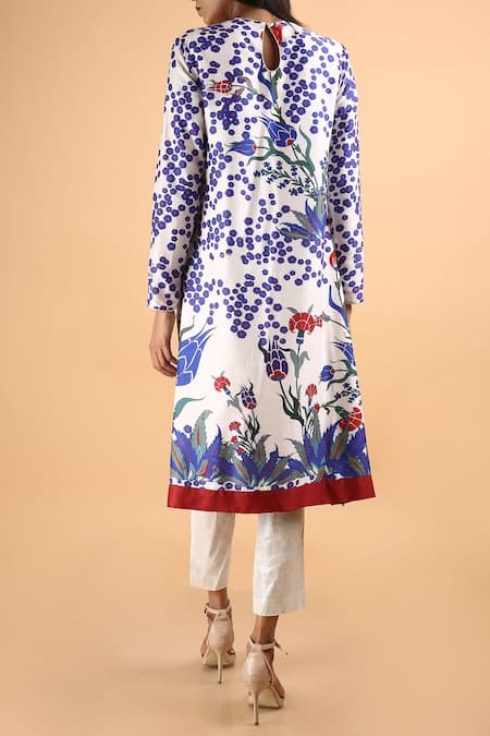 Blue & ivory base knee-length kurta with all over floral print motifs.