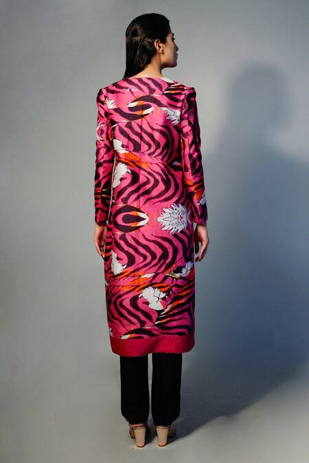 Pink kurta with all-over panther-floral print, overlap detail, full sleeves & straight silhouette.