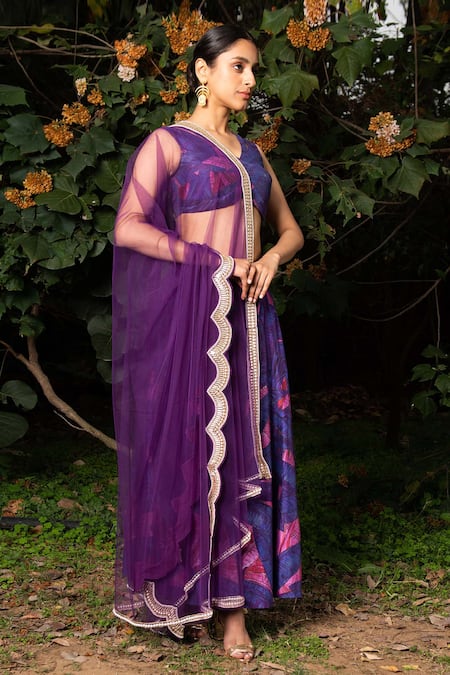 Purple lehenga with banana tree printed motifs. Comes with printed blouse and net dupatta.