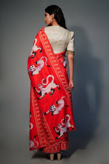 Red Saree Chanderi Blouse Lurex Floral, Tiger Printed